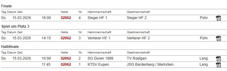 Das findet statt in einem kleinen Turnier mit 2 Halbfinalspielen, bei denen der Erstplatzierte der regulären Meisterschaft gegen den Viertplatzierten sowie der Zweitplatzierte gegen den Drittplatzierten der Tabelle spielen wird, um daraus die Finalisten zu ermitteln. Austragungsort ist die Halle des TV Rötgen und startet am 15.03 um 10.00 Uhr mit dem Spiel SG Düren 1899 – TV Rötgen, und im Anschluss das Spiel KTSV Eupen – JSG Bardenberg/Merkstein. Das Finale wird am selben Tag um 16.00 Uhr stattfinden.